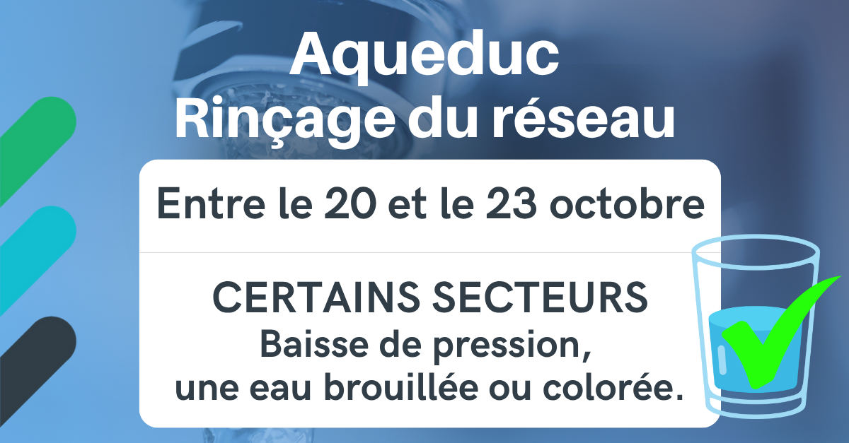 La Municipalité avise les citoyens que le rinçage du réseau d’aqueduc se poursuivra entre le 20 et le 23 octobre 2025, afin de compléter les secteurs qui n’ont pu être faits précédemment.
