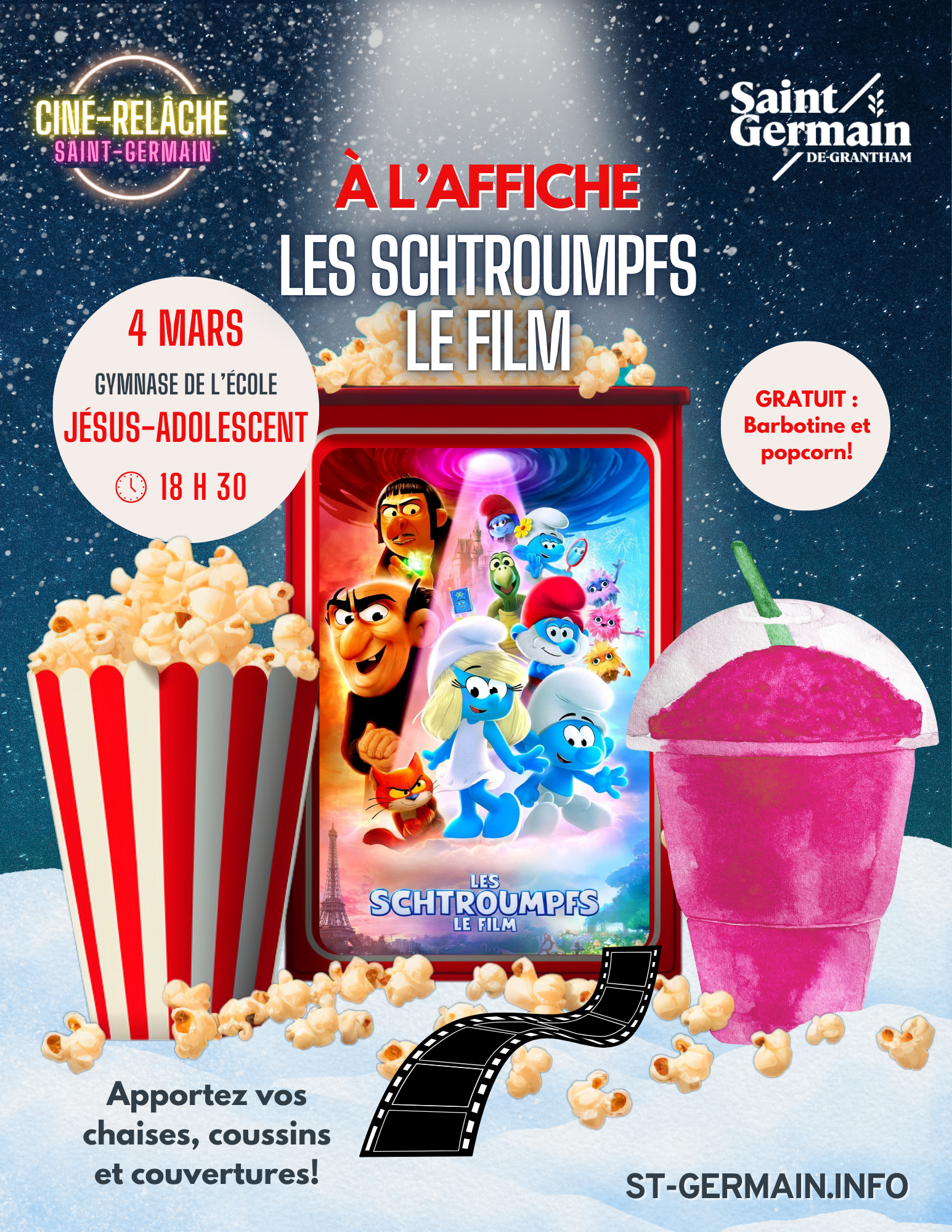 18:30 -21:00 2026.03.04 https://st-germain.info/index.php/event/cine-relache-2026-03-04/  Rejoignez-nous au Gymnase de l’école Jésus-Adolescent, le 4 mars, pour la projection du film Les Schtroumpfs – Le Film. Gymnase de l’école Jésus-Adolescent Barbotine et popcorn gratuits 🍿 Apportez vos chaises, coussins et couvertures Synopsis du film Lorsque le Grand Schtroumpf est mystérieusement kidnappé par les vilains sorciers Razamel et Gargamel, la Schtroumpfette et son meilleur ami le Schtroumpf Sans-Nom partent en mission pour le retrouver. Commence alors une aventure délirante où ils vont croiser la route de nouveaux amis comme Mama Poot et ses petits. Les Schtroumpfs doivent prendre en main leur destin pour sauver celui du monde entier. Une activité idéale pour toute la famille!