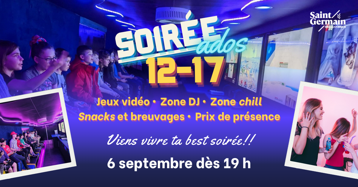 19:00 -22:00 2025.09.06 https://st-germain.info/index.php/event/soiree-ados-2025/  Une soirée réservée aux 12 à 17 ans. Jeux vidéo, danse, musique, prix de présence et grignotines seront au rendez-vous! 📅 Samedi 6 septembre, 19 h à 22 h 📍 Centre des loisirs Emballages Box Pack – Saint-Germain-de-Grantham 💲 Gratuit Au programme : 🎮 Une remorque pleine de jeux vidéo 🎵 Zone disco avec DJ 😎 Espace chill pour relaxer 🍿 Snacks et breuvages à volonté 🎁 Prix de présence vraiment hot Concours Facebook Félicitations à notre gagnante : Roxanne Henrie