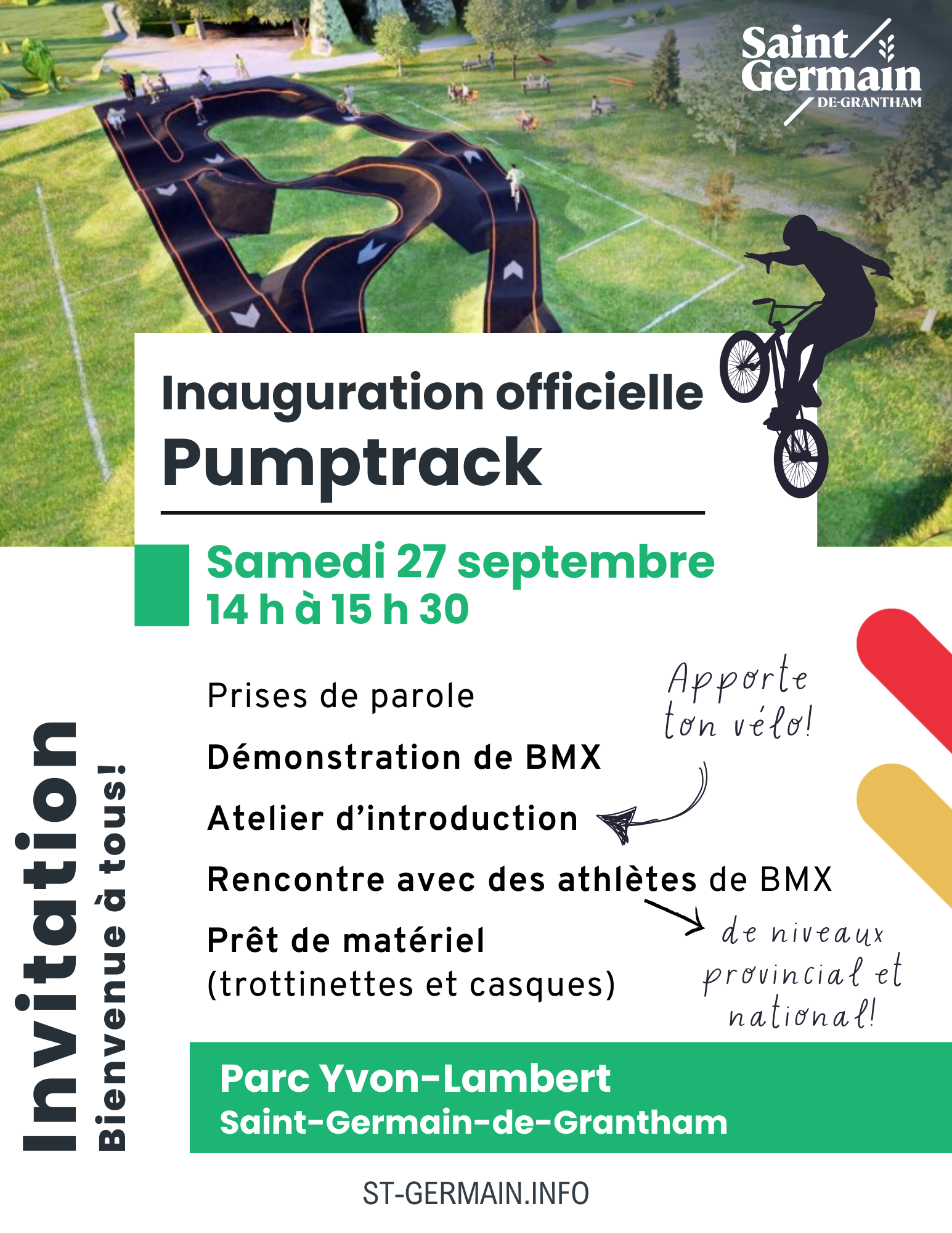 14:00 -15:30 2025.09.27 https://st-germain.info/index.php/event/inauguration-de-la-pumptrack/  🚴♂️ Nous sommes à deux doigts d’ouvrir officiellement la nouvelle pumptrack! ✨ Pour marquer l’occasion, nous vous invitons à une activité d’inauguration où toute la population est la bienvenue! 🎉 📅 Samedi 27 septembre à 14 h 📍 Parc Yvon-Lambert, pumptrack (entre le volleyball et le soccer) Au programme : - Prises de parole