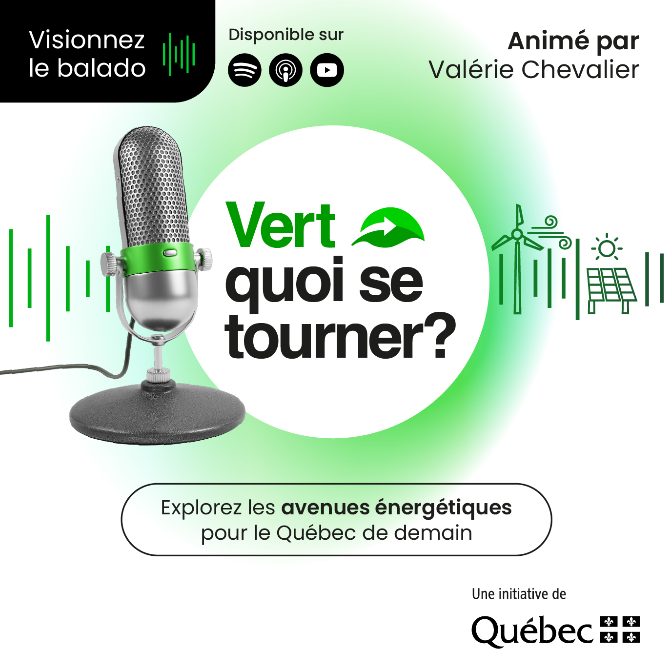 Animé par Valérie Chevalier, le balado Vert quoi se tourner? consiste en une série d’épisodes conçus pour outiller la population, les décideurs et les acteurs du territoire face aux grands enjeux énergétiques. On y explore les solutions énergétiques d’avenir : hydroélectricité, éolien, solaire, bioénergies, hydrogène vert et autres.
